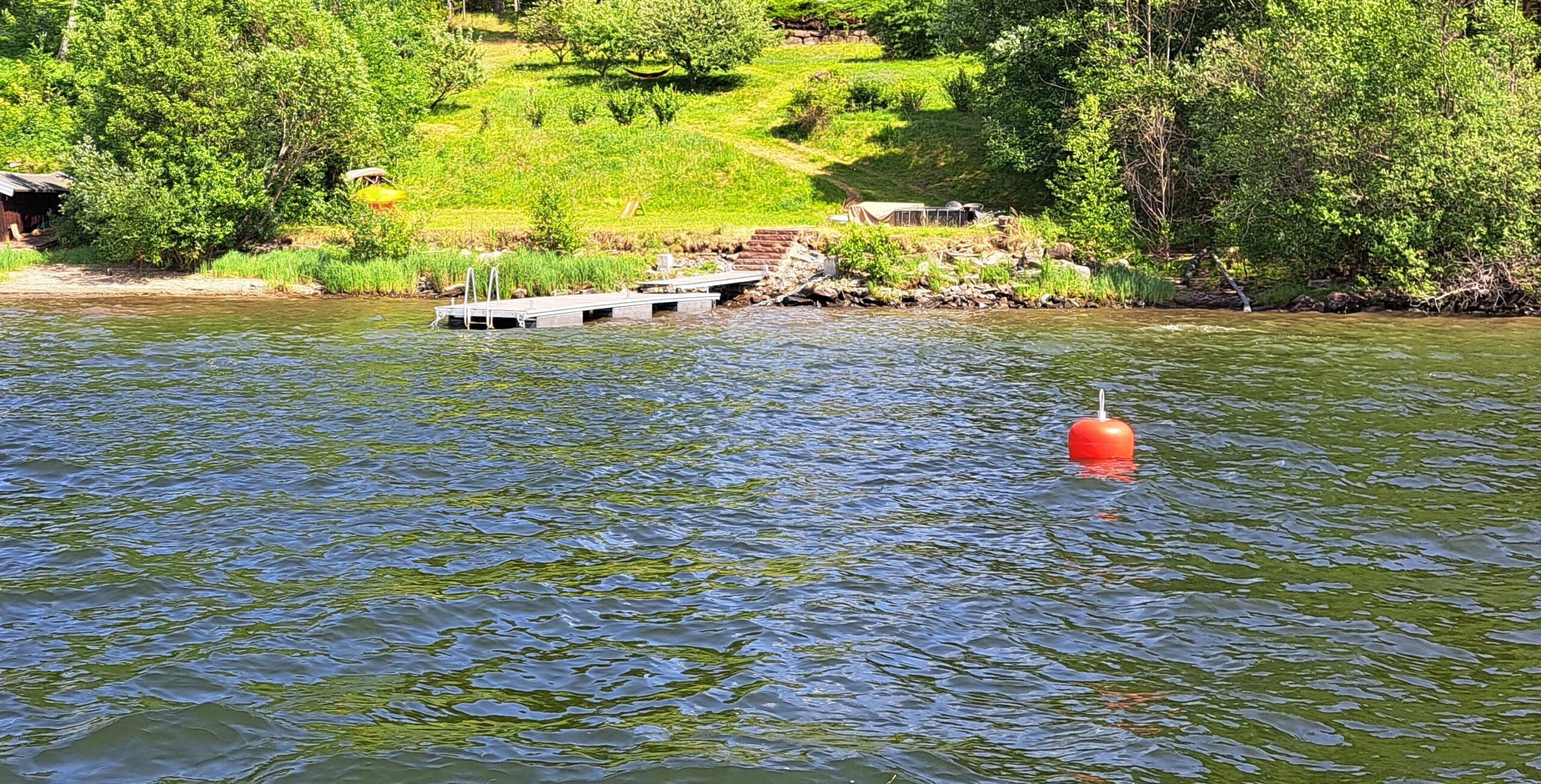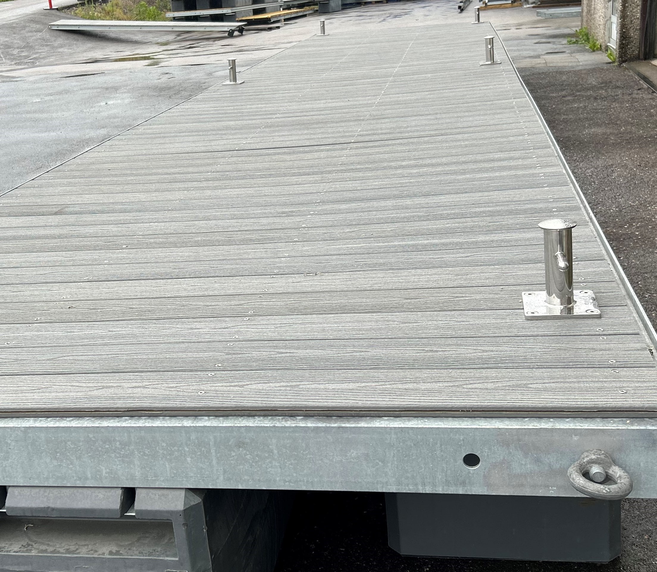 Denne bryggen har et tredekke med kompositt materiell. Bryggen ble levert til en privatkunde i Hønefoss. Bryggen har en stålramme og plastflytere.