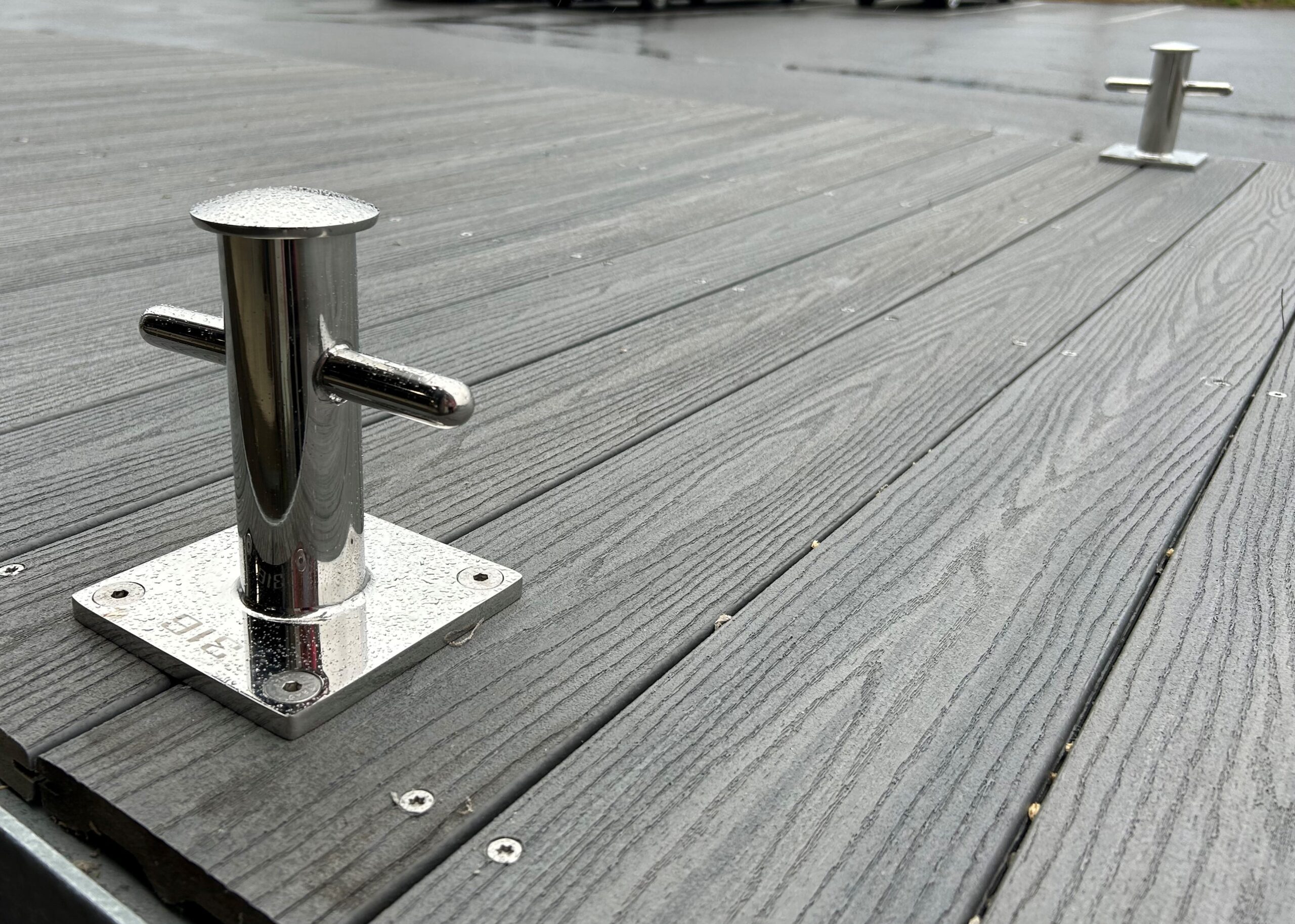 Komposittdekket er gråfarget. Denne type materiell krever nesten ingen vedlikehold.
