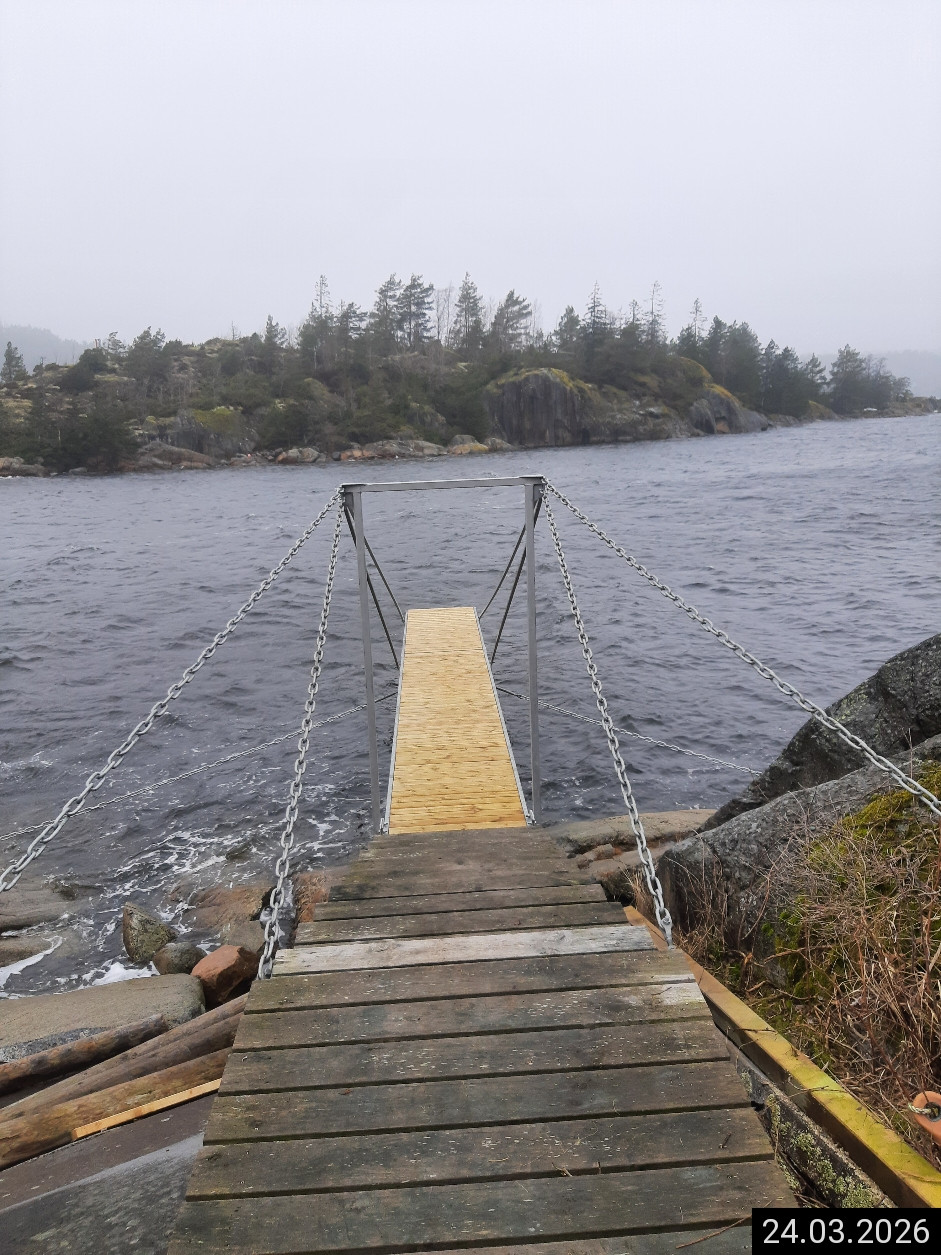 Bryggen er bygget med galvanisert stålramme og trykkimpregnert tredekke, og er montert direkte i fjell. Resultatet er en brygge som ligger naturlig i terrenget, gir enkel tilgang til sjøen og samtidig tåler vær og vind.