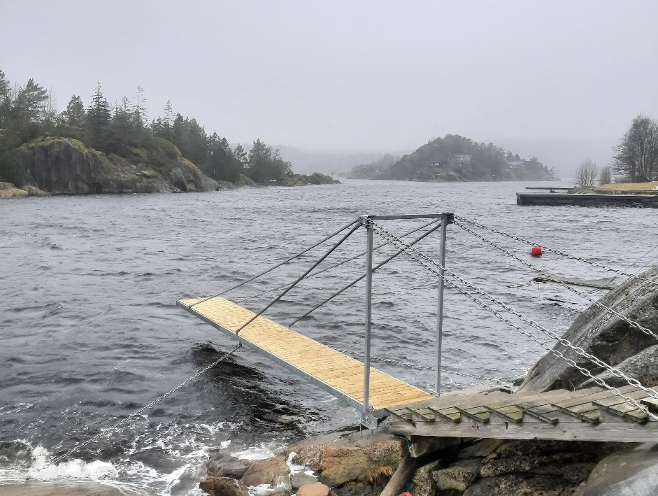 Bryggen er bygget med galvanisert stålramme og trykkimpregnert tredekke, og er montert direkte i fjell. Resultatet er en brygge som ligger naturlig i terrenget, gir enkel tilgang til sjøen og samtidig tåler vær og vind.